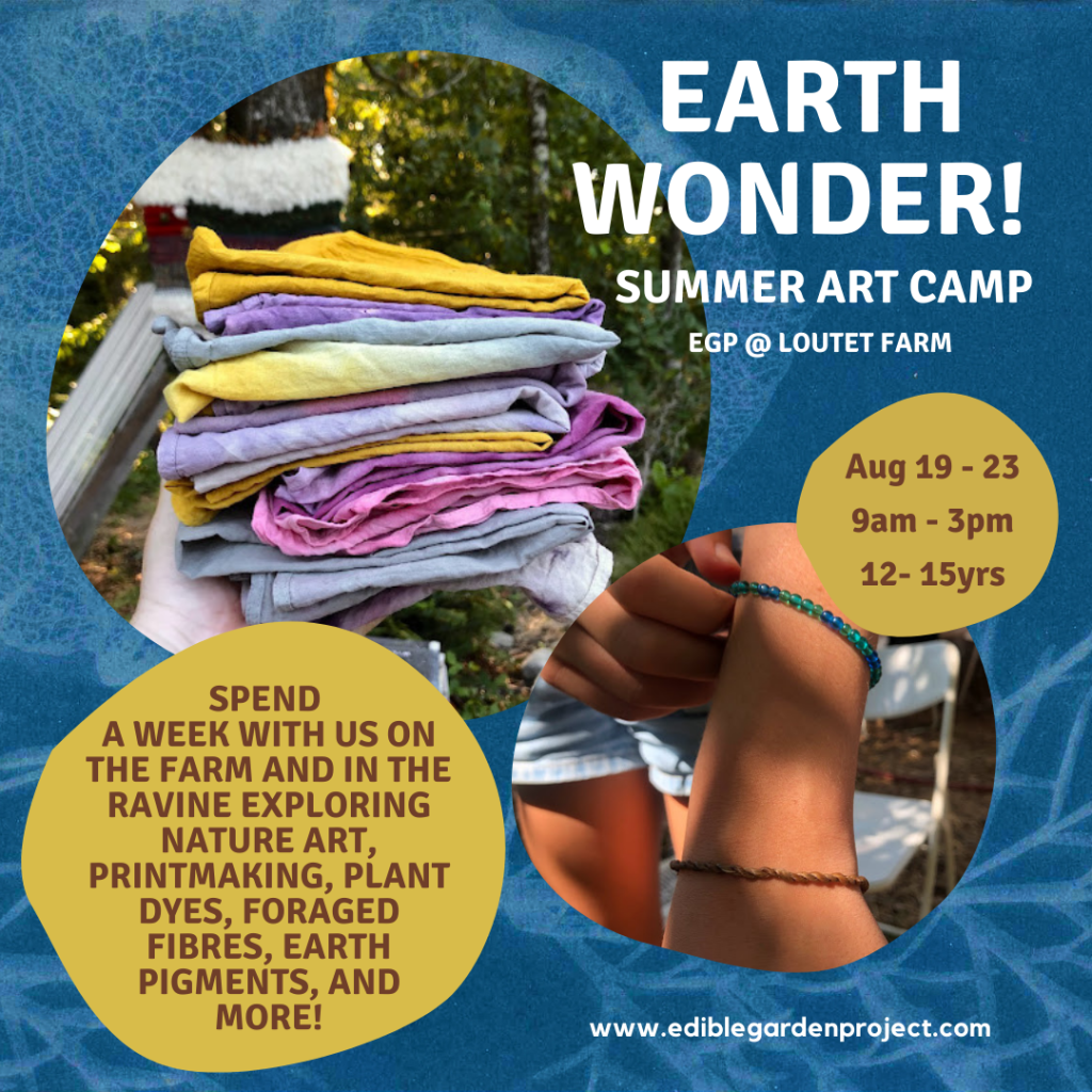 We are so excited to be making art on the farm this summer! At camp we will be learning new techniques such as making earth pigments, botanical dyeing, weaving, solar photography, working with plant fibres, and more. We will share our art together as well as looking at, discussing, and being inspired by other artists who have made land based art. Each day we will explore a new technique, and we will also have self directed time for students to take those techniques further or work on a project of their own with the support of our art camp mentors.